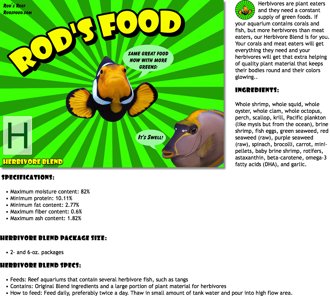 Herbivores are plant eaters and they need a constant supply of green foods. If your aquarium contains corals and fish, but more herbivores than meat eaters, this is the blend for you. Your corals and meat eaters will get everything they need and your herbivores will get that extra helping of quality plant material that keeps their bodies round and their colors glowing..