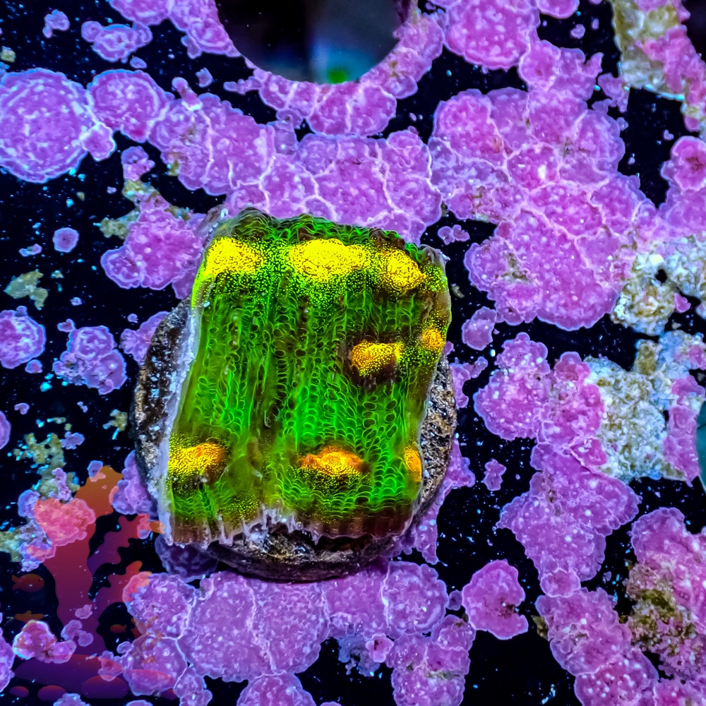 Spot-feeding with meaty foods such as mysis shrimp, zooplankton, or reef roids 2–3 times per week encourages polyp expansion and vibrant growth. While LPS corals receive energy from light, supplemental feeding improves coloration, health, and long-term success.